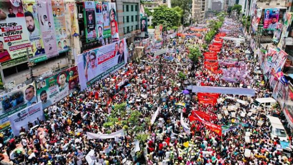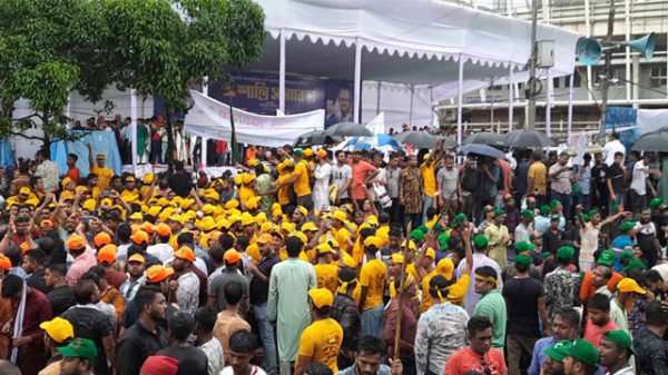 বর্ষার আকাশের হঠাৎ বৃষ্টি। এর মধ্যেই শুরু হয়েছে আওয়ামী লীগের তিন সংগঠনের ঢাকা বিভাগীয় শান্তি সমাবেশ৷ উপস্থিত সমর্থকদের গান-স্লোগান ও কবিতা আবৃত্তির মধ্য দিয়ে সমাবেশ শুরু হয়েছে। শুক্রবার জুমার নামাজের