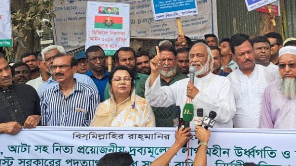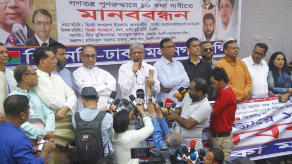 আওয়ামী লীগ সাধারণ সম্পাদক ওবায়দুল কাদের বলেন, ‘আপনারা ভালো আছেন? কিন্তু ফখরুল ভালো থাকতে দেবে না। আপনারা খুশি থাকলে বিএনপি বেজার। পথ হারিয়ে বিএনপি এখন মানববন্ধনে। এমন অবস্থা হয়েছে ‘‘ফান্দে