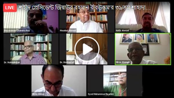 বিএনপির প্রতিষ্ঠাতা শহীদ প্রেসিডেন্ট জিয়াউর রহমানের ৩৯তম শাহাদাতবার্ষিকী উপলক্ষে ভার্চুয়াল আলোচনা সভা করছে বিএনপি। শনিবার বিকেল তিনটায় এই আলোচনা সভা শুরু হয়। বিএনপির মহাসচিব মির্জা ফখরুল ইসলাম আলমগীরের পরিচালনায় আলোচনা