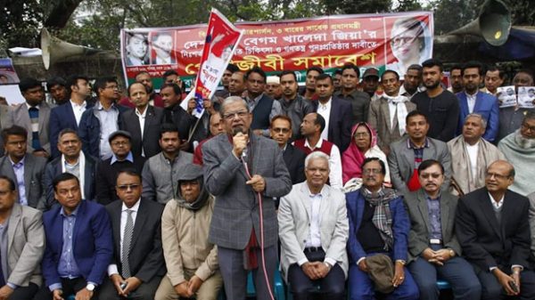 সড়ক পরিবহন ও সেতুমন্ত্রী ওবায়দুল কাদেরকে এমপি-মন্ত্রিত্ব ছেড়ে নির্বাচনের কাজ করার জন্য আহ্বান জানিয়েছেন বিএনপির মহাসচিব মির্জা ফখরুল ইসলাম আলমগীর। শনিবার জাতীয় প্রেসক্লাবের সামনে বাংলাদেশ সম্মিলিত পেশাজীবী পরিষদ কর্তৃক বেগম