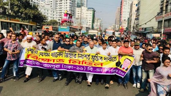 কারাবন্দী বিএনপি চেয়ারপারসন খালেদা জিয়ার জামিন আবেদন আদালত খারিজ করে দেওয়ার প্রতিবাদে ও তার নিঃশর্ত মুক্তির দাবিতে রাজধানীতে বিক্ষোভ মিছিল করেছে বিএনপি ও অঙ্গসংগঠনের নেতাকর্মীরা। বিএনপির সিনিয়র যুগ্ম মহাসচিব রুহুল