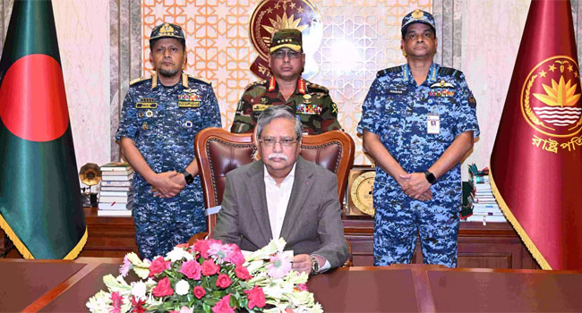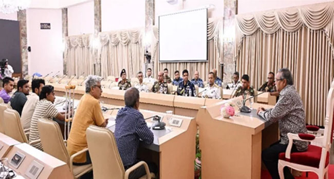 রাষ্ট্রপতি মো: সাহাবুদ্দিনের সাথে তিন বাহিনীর প্রধানগণ ও বৈষম্যবিরোধী ছাত্র আন্দোলনের সমন্বয়কদের মঙ্গলবার (৬ আগস্ট) রাতে তিন ঘণ্টার বেশি সময় ধরে চলা বৈঠকের পর নোবেল বিজয়ী অধ্যাপক ড. মুহাম্মদ ইউনূসকে