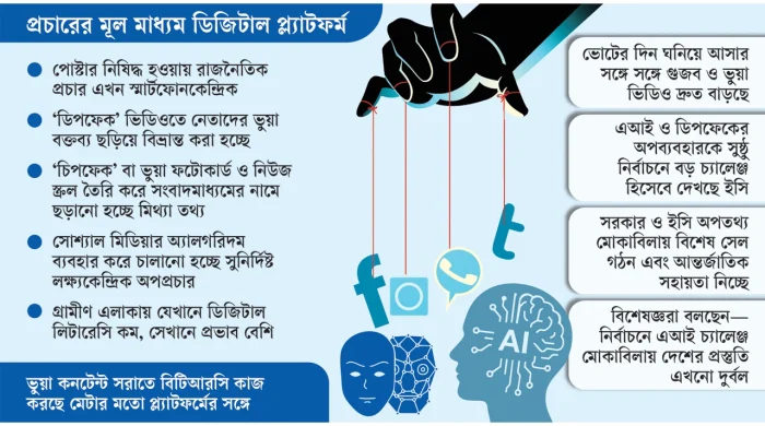 বাংলাদেশের রাজনৈতিক ইতিহাসে ত্রয়োদশ জাতীয় সংসদ নির্বাচন এক নজিরবিহীন বাঁকে দাঁড়িয়ে আছে, যেখানে প্রথাগত প্রচারের জায়গা দখল করে নিয়েছে ডিজিটাল প্রযুক্তি। এবারের নির্বাচনে দেয়ালজুড়ে কাগজের পোস্টার নিষিদ্ধ হওয়ায় ভোটারদের মন