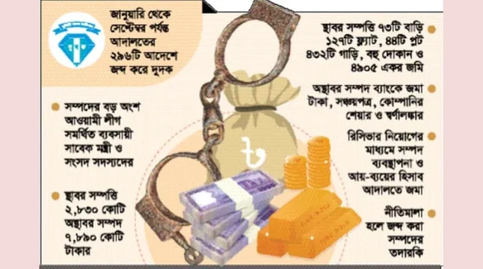 দুর্নীতির লাগাম টানতে বড় ধরনের অভিযান চালিয়েছে দুর্নীতি দমন কমিশন (দুদক)। চলতি বছরের জানুয়ারি থেকে সেপ্টেম্বর পর্যন্ত ৯ মাসে বিভিন্ন ব্যক্তি ও প্রতিষ্ঠানের প্রায় ১১ হাজার কোটি টাকার স্থাবর ও