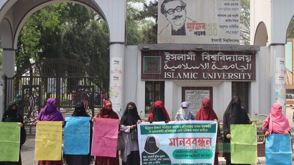 বিশ্ববিদ্যালয়ে ভর্তি পরীক্ষাসহ সকল সরকারি বেসরকারি কাজে নারী শিক্ষার্থীদের হিজাব খুলে কান বের করে ছবি দেওয়ার পরিবর্তে বায়োমেট্রিক পদ্ধতি ব্যবহারের দাবিতে মানববন্ধন করেছে ইসলামী বিশ্ববিদ্যালয়ের (ইবি) শিক্ষার্থীরা। সোমবার বেলা ১১টায়